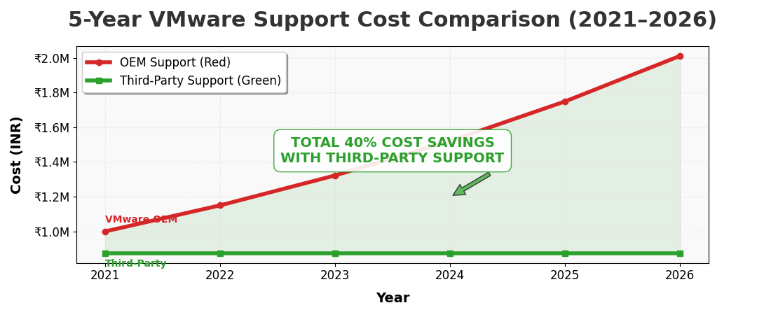 In 2026, especially with Broadcom changes, third-party VMware support isn’t just cheaper - it allows enterprises to control lifecycle, performance, and costs in a way OEM cannot match.